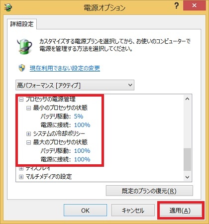 「プロセッサの電源管理」から「最小のプロセッサの状態」と「最大のプロセッサの状態」の両方を「100%」にすると、CPUの能力が常に100%使用されることになるので、PCの動きが常に高速になります。