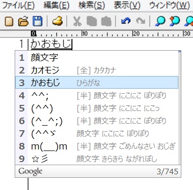 「かおもじ」と入力すると745個の候補が表示されます。他にも、「にこにこ」や「きらきら」などと入力しても顔文字は表示されますので、メールやSNSなどの書き込みの時に便利です。