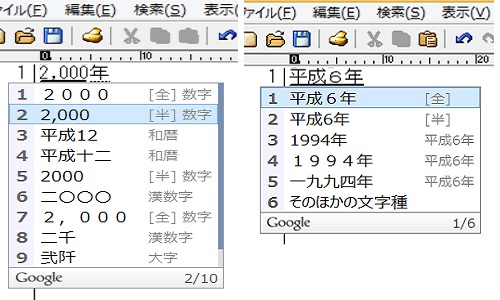 「2000ねん」と入力すると変換候補に和暦の「平成12」が表示されますし、「へいせい6ねん」と入力すると「1994年」という西暦の変換候補が表示されます。