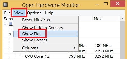 OpenHardwareMonitorの画面が表示されたら、「View」を選び、「Show Plot」をクリックします。