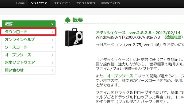 「アタッシェケース」のダウンロードサイトにアクセスして、「ダウンロード」をクリックします。