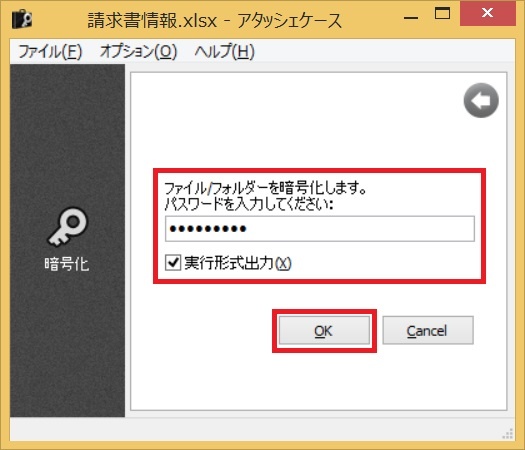 「パスワード」を入力してして、「実行形式出力」にチェックを入れて、「OK」をクリックします。