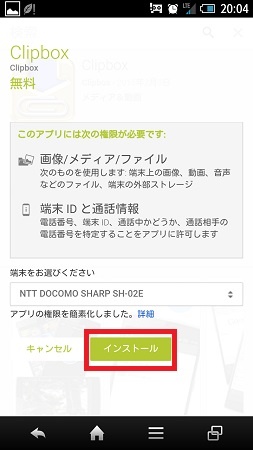 「アプリに必要な権限」が表示され、端末を選んだら、「インストール」をタップします。