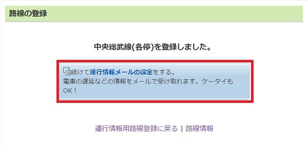 これで、登録した路線で遅延や事故が発生した場合や遅延が発生する見込みがある場合にメール通知が届くようになります。