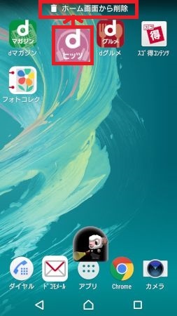 ロングタッチすると、画面上部に「ホーム画面から削除」と表示されますので、ロングタッチしているアイコンをスライドさせて「ホーム画面から削除」の文字の上に持って行き離すことで消すことができます。