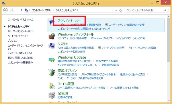 「スタート」ボタンを右クリックしてメニューを表示し、「コントロールパネル」をクリックし、コントロールパネルの画面から、「システムとセキュリティ」 ⇒ 「アクションセンター」をクリックします。