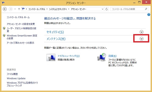 アクションセンターの画面が表示されたら、メンテナンスの右端にあるボタンをクリックします。