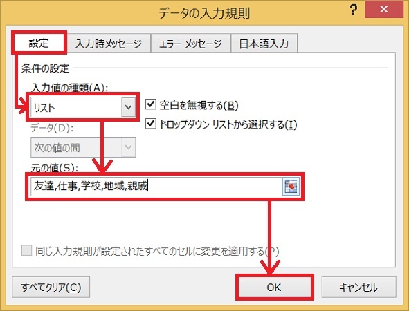 元の値には区分を入力します。今回は「友達,仕事,学校,地域,親戚」と入力しました。この区分は必要に応じて修正・追加して下さい。