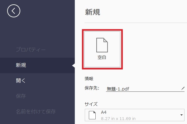 保存先・サイズ・向きを選んだら「空白」ボタンをクリックします。