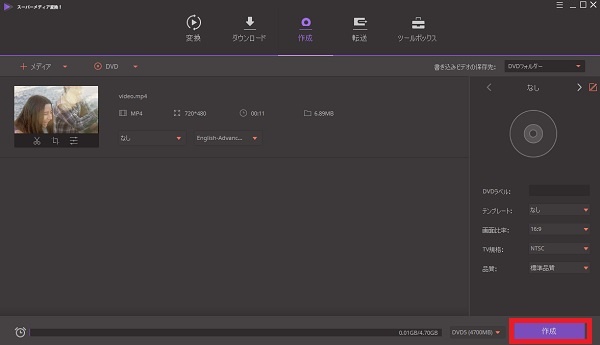 右下にある「作成」をクリックすると、DVDまたはブルーレイの作成が始まります。